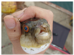 車を南下させて東燃裏へ向かいました。朝まずめはキス、ベラなどがあがりました。途中から大雨が降り始め、レインコートと長靴は車でしたので一時退散しました。普通ならここで納竿ですが僕は違います。その間にエサを買い足し、40分ほどの仮眠をとりました。仮眠後、雨が落ち着くまではサビキをしようかと始めるやいなや小アジ、小サバが入れ食いでした。写真左は合間に釣った口唇口蓋裂?のフグです。びっくりしました。外傷ではなさそうでした。