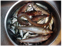 ただ到着しても当然真っ暗なので、夜明けまで夜も明るい新和歌浦へ出かけました。あいかわらず釣り人はあまりいません。全く期待することもなく竿を出して夜明けを待ちました。夜が明けたら東燃裏に行こうと思いました。セブンイレブンの冷たいラーメンを食べ、4時前になりましたのでそろそろ…と思い、竿を納めようとリールを巻いてきたら、なんだか根掛かりしたような感触でした。しかし水面にあがってきたのは久しぶりのアナゴでした。この時期に珍しいと思いましたが、もう少し暑くなったらアナゴ釣りに来ようと今回は引き上げました。