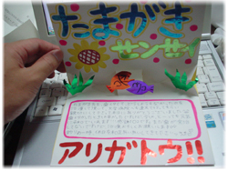 手作りのメッセージカード、しかも先生が大スキなさかなが飛び出してる!とってもうれしいプレゼントですね~!!!