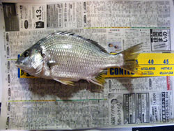 アナゴかと、恐る恐る巻いてきました。アナゴにしてはビッグファイトだな、思っていましたら、水面上に姿を現したのはキビレでした。慎重にタモに納めました。